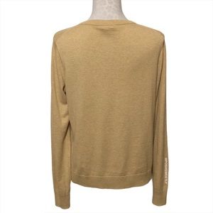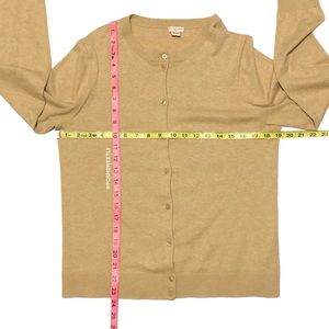 Super soft cardigan by J.Crew in Camel/Tan 100% cotton knit. Buttons all the way down the front. Round neckline. Long sleeves. Lightweight and comfortable. Excellent condition. Machine washable. Size large. See photos for exact unstretched measurements.