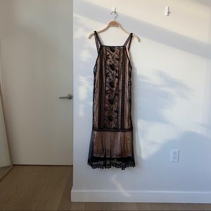 ASOS Lace Midi Dress in size US0, fits true to size, was more boxy on me than the model on website when I purchased. Can’t find stock images anymore but I modeled on my XXS 00P frame and just never wore. Not bra friendly but comes with a slip inside that can be removed (it’s buttoned to the straps). NWT.