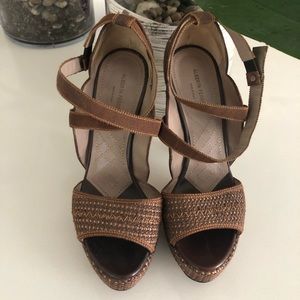 A tan color slouchy Prada cardigan. There’s a silk strap with gold buckles that is attached to the front and goes around the neck .made of wool/silk. Very soft to the touch . It’s size 42 which is a 6 , but it’s great to wear it even if u are a 2 or a 4 as a over size slouchy top . Hardly worn.
