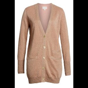J.CREW Collection Long Cardigan In Double Knit Pink Lurex. The double-knit, inside is soft. Shimmery metallic fabric. Front Materials: 64% Polyester, 36% Metallize Fiber Inside Materials: 100% Cotton. Beautiful cardigan, excellent condition. Size XS, but can also fit S. More prettier in person! Inside is incredibly soft!