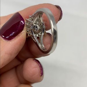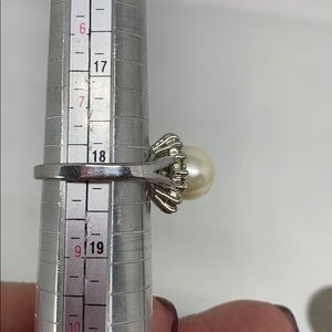 Beautiful creamy color faux pearl surrounded by simulated prong set diamonds set in a silver plated setting. Measures a size 8. Pearl in excellent condition, all diamonds intact. Minor markings to band. Rings with a ๐ in description are $9 each, 2/$15.