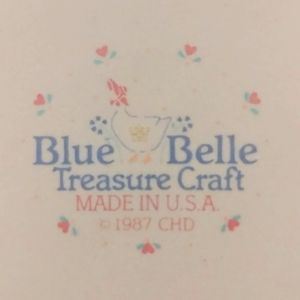 RARE, beautiful vintage Blue Belle (pattern) covered crock-style casserole dish by Treasure Craft. No indication of capacity marked or printed on the dish, but appears to be 2.5 -3 quart. No chips, cracks or crazing on lid or dish; some faint utensil marks inside dish. Probably has only been used once, maybe twice. Like new condition. Smoke free home. Made in USA. Packed with exceptional care ❤.