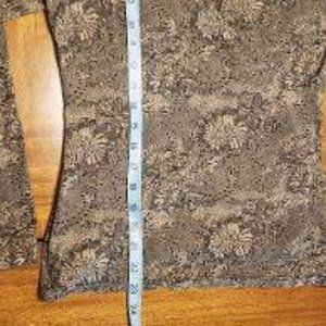 This shirt has a beautiful floral print. I zoomed in on one of the pictures to show. Nice neutral colors. Looks great worn with black.