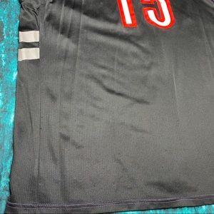 This vintage Vince Carter jersey is in used condition. It has been worn and does have minor staining and one small hole underneath the arm. As well as light cracking on the graphic (as seen in photos). The jersey is a size XL and the measurements are as follows...