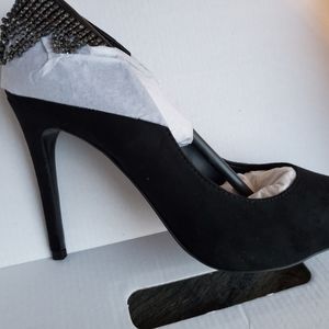 Black microsuede heels with subtle rhinestone jeweled heels.