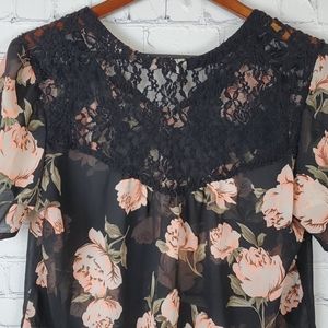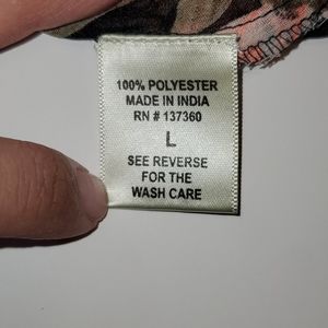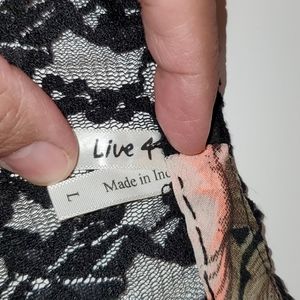Live 4 Floral Blouse. Size L. Has embroidery in the back,sheer and light. Beautiful print and colors. Black with peach almost pink colored rose print.