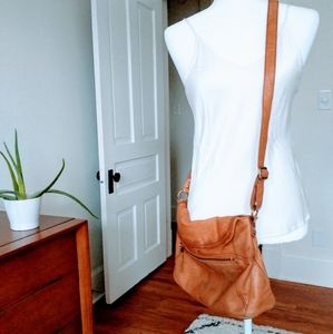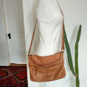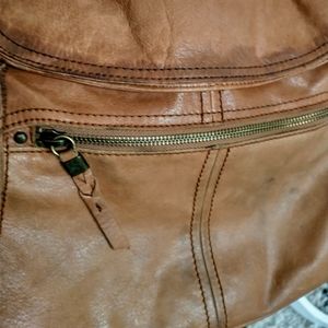 The Sak Leather Crossbody Purse. This has been loved but still has life to give. It's a very soft leather with a fold over magnetic closure. It does have some marks and is weathered looking but no tears or torn leather anywhere. It's a great bag especially for those who like a used leather look.