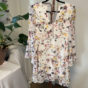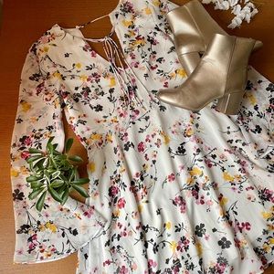 I love the woodland fairy vibes of this dress! All over floral print, with sheer bell sleeves. V-neck & back, with decorative knot at neckline. If it wasn’t too small, you know I would be keeping this for date night! But it is, so I’m not, & here we are.