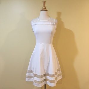 Flirty, sheer inserts across the bust and at the hemline, sleeveless, figure flattering fit and flare skater style. Lined skirt. Side zipper.