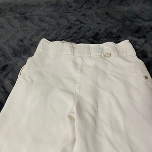 Vintage Moncler wide leg pant in a crisp white, sz 44 — perfect for spring and summer! Beautiful soft silhouette, 100% viscose. Inseam is 27” but there is appx 1.5” that can be let out. Please note any fabric discoloration, as pictured. Authentic. *These aren’t my size, cannot model*