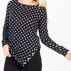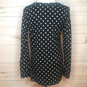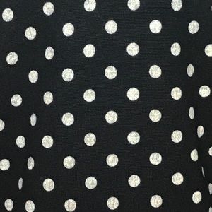 Black and light gray polka dot. Hacci sweater material. Soft and cozy!! Notched asymmetrical side with buttons. Super cute. Covers the bootie!! True to size or size up.