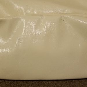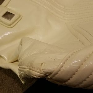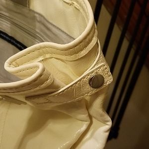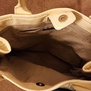 White satchel/tote bag used a few times. 2 short straps to carry over shoulder or by hand. One inside zippered pocket. 2 buttons on side of purse to expand the bag when unbuttoned. Top button enclosure. Design on front. Small dot discoloration on back as seen by picture. Hardly noticeable spot and 2 scuff marks on lower back bottom of purse shown in picture. 2 small spots on bottom of purse. Left side pocket, small slit which may have been caused by me storing it folded.