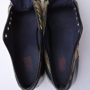 SIZE 6. COACH Folly logo canvas & leather sneakers shoes. Ladies classic canvas logo athletic sneakers. Super stylish. Lace up. Navy patent leather on back heel. Clean inside and out and comes from a smoke free home. Condition: preowned. Please zoom in all pictures for details and condition. Item in pictures is the exact item you are purchasing.