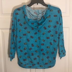 Super cute Hi-Lo hoodie with retro camera pattern. Material is thin and light. 3/4 sleeves. Measurements: shoulder to front hem- 17 1/2” shoulder to back hem -22” pit to pit - 22” Feel free to ask any questions or make an offer. From a clean smoke and pet free home! Don’t forget to bundle and save! 💵This emoji means 3 tops for $15! Or get 15% or more off 2+ items!