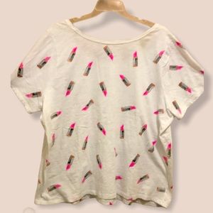 Lane Bryant lipstick shirt/100% cotton/ 26/28/features pink lipstick 💄/this is so cute/ preloved it’s in good condition/ no flaws just normal wear/this will be so cute to lounge in or wear to beach it’s just adorable 🥰 Rounded neckline /pit to pit is 28 “shoulder to hem is 27 “ these measurements were taken laying😎Thanks for checking out my closet