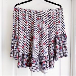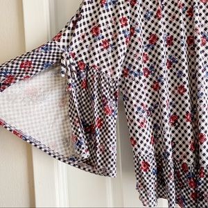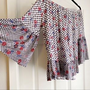 Features: dark blue and white gingham with floral pattern, off the shoulder peplum blouse, split bell sleeves with tie, flowy flattering fit, lightweight stretch knit