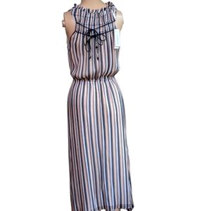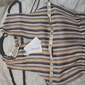 Derek Lam 10 Crosby Silk Asymmetric Dress Sleeveless Long Multicolor Size 0. Earth Tones Striped, Made With 100% Silk. Wide Ruffled Shoulder Straps. V Neck With Beaded Drawstrings. Stretchy Waist. Length Is Long With Asymmetric Hem, Longest On The Sides. Condition Is "New With Tags".