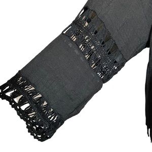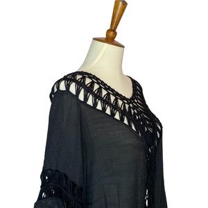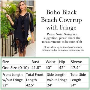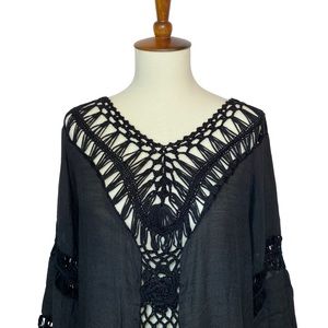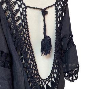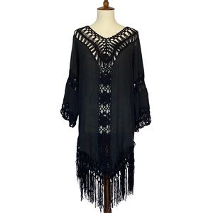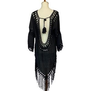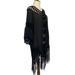 This sexy coverup has a soft, lightweight, flowy knit, with a V-cut neckline, and crochet detail down the front. It has 3/4 sleeves with eye catching cut outs, and a flattering high low, hemline with fringe. Perfect to throw over your swimsuit or bikini to head into town for lunch.