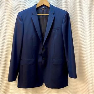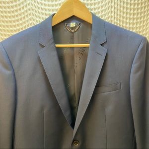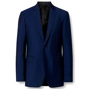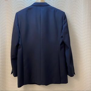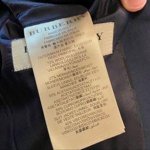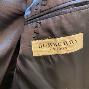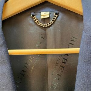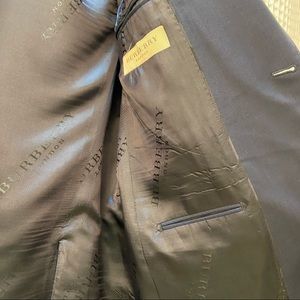 Details: excellent condition like new (recently. Dry-cleaned) navy blue wool blend exterior, custom Burberry silk lined inside, two button style, two front pockets, breast pocket, three inside pockets
