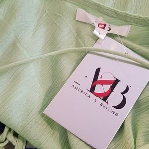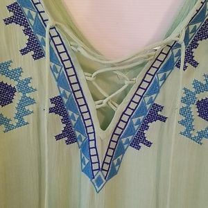 America & Beyond embroided Kaftan is easy, breezy boho chic! Lightweight embroided caftan has v-neck design with lace up detail. Blue tassel accents. Sleeves have split sleeve design. Brand new with tags!