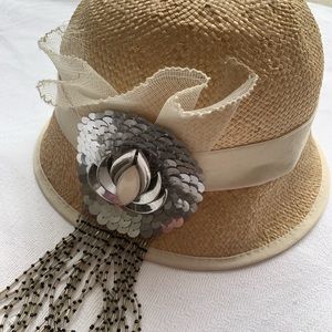 Mimco hat with ribbon & attached brooch. Sequins and beadwork surround the brooch.