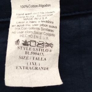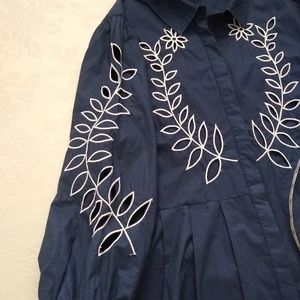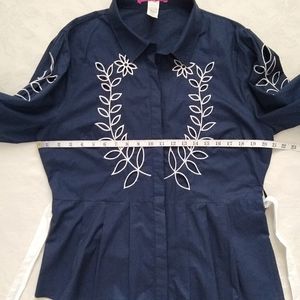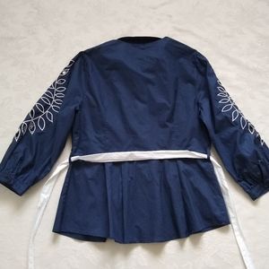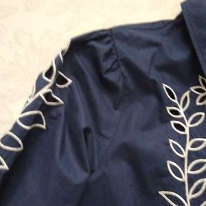 Made in USA. Cotton. Puff sleeve. Pleated peplum. Front concealed buttons closure. Navy blue with white embroidery cut out. Like new, excellent condition.