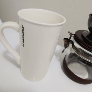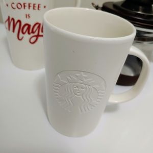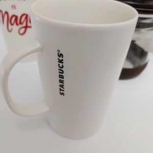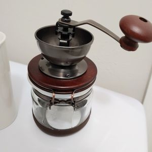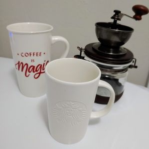 Bundle Hario locking canister coffee mill and 2 Starbucks coffee mugs. Hario mill is .5 Liter. Top mill cap is missing. It is in very good condition otherwise. 16 oz Magic Starbucks mug 2019 looks new. 12 oz Mermaid mug 2014 looks new also. It's like getting the mugs for free! Note: Tried making a lid for it out of a plastic container lid see last photo.