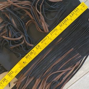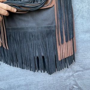This fringe Suede Leather bag is so beautiful even for every day use..the fringes are leather the part that holds them is black thick material