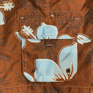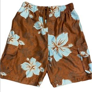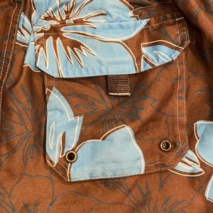 Great board short with adjustable waist in brown white hibiscus print in turquoise. Side pockets, cargo pockets and back pocket.