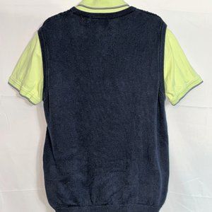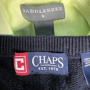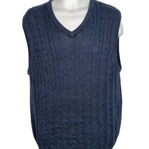 1. Sweater Vest is by CHAPS! Navy blue in color; classic cable knit with V-neckline. Made of 100% cotton (machine wash/tumble dry). CHAPS crest logo is embroidered on the front. 44" chest; 28" length. GREAT condition!