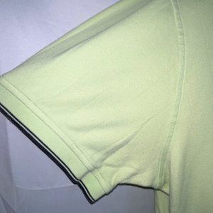 2. Polo Style Shirt is by SADDLEBRED! Lime green in color with navy blue trim accents; short sleeves with 3 buttons and collar. Made of 100% cotton (machine wash/tumble dry). 50" chest; 28" length. Good Condition with 1 small pin hole in the back.