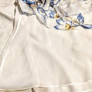 Sheer white blouse with white lining and blue, yellow, black and brown floral pattern. It features a gorgeous embroidered design around the collar. Flowy and cool, perfect for summer. In excellent pre-loved condition.