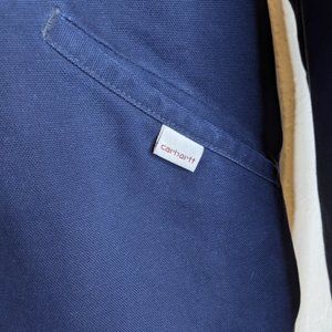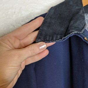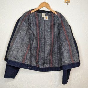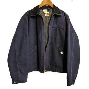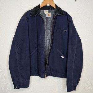 A fabulous Vintage Carhartt 1889-1989 100th Year Anniversary Blanket Lined Detroit Jacket in Deep Navy blue with a Black Corduroy collar. This jacket is in fantastic condition, even without considering it's age. Some light fading in the usual places, seams,tips of collar, cuffs. Gold 100 year Anniversary buttons on cuffs and back waist show minor wear but the gold color is solid. YKK front Zipper. Carhartt tag at hip pocket. No size tag, see measurements in comments.