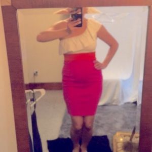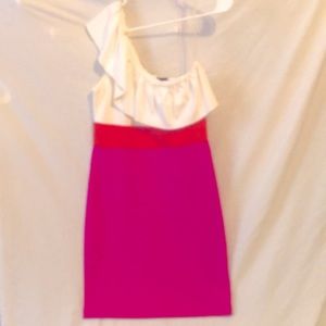 Pink, white and orange dress. Stretch in fabric. No stains or rips. Clean. EUC
