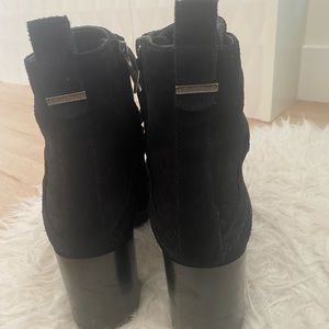 Lace-up ankle boot in suede and leather with inside zipper, stacked heel and lug sole.