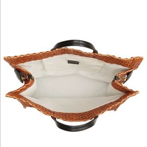 An intricate basket weave brings sophisticated texture and dimension to a simply styled tote with room for all the essentials and then some. Slim top handles and a removable black leather strap (not pictured) add carrying versatility to the go-to look.