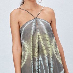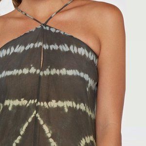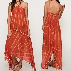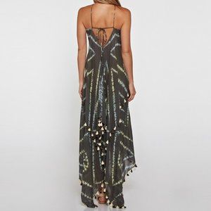 Moroccan Scarf Print Tie Handkerchief Maxi. Handkerchief hem boho style with a keyhole detail. Tie dye scarf print feature mini tassel pom pom trim. Sexy sheer backless feel summer halter beach dress. Asymmetrical. Adjustable spaghetti strap. Sleeveless.