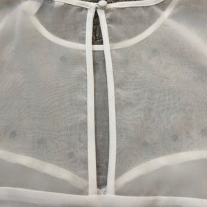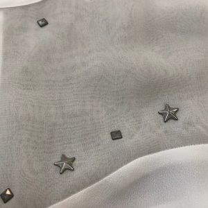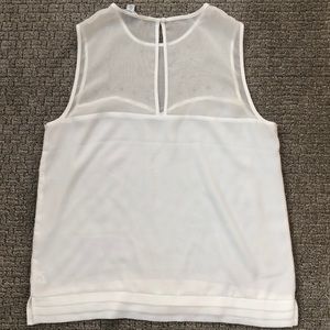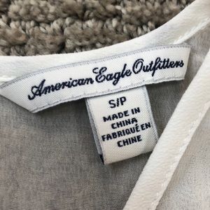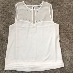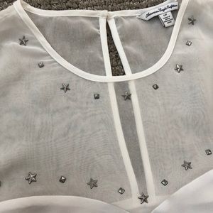 Beautiful crisp white star studded American Eagle tank top! Sweetheart neckline accented with star and square studs add a little edge to this beauty. Pleats on bottom. Keyhole button back pictured. Top is shear with studs, bottom is thin white material. Excellent condition. Please note very slight discoloration on armpit.
