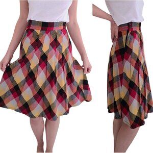 60/70s Autumn A-Line Vintage Plaid Check Side-Button Pleated Skirt XS 24" waist