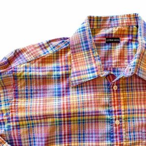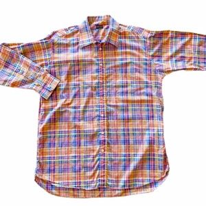 This colorful plaid dress shirt ships to you in "like new" condition. It has only been worn once and is pristine with no visible stains or snags. Brand Gitman Bros., men's XL. Sleeve length laying flat 25 inches. Overall length laying flat 36 inches. Arm pit to arm pit laying flat 26 inches. 100% imported cotton. Machine washable, tumble dry.