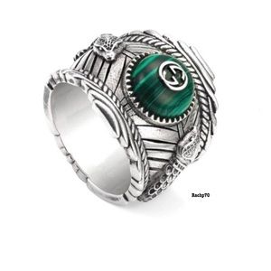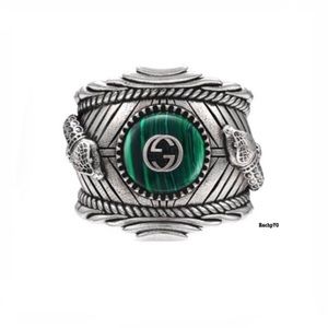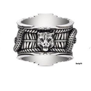 This stunning 925 sterling silver ring has an arabesque engraved pattern that is complemented by three-dimensional Kingsnakes. The center stone is topped with the interlocking GG