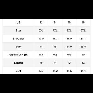 0XL= 12 • 1X=14 • 2X=16 • 3X=18 • 4X=20