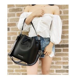 Michael Kors Eden Medium Bucket Bag Shoulder Tote Black Leather Crossbody, NWT in bag. Comes with black leather and grey shoulder straps which are interchangeable. Button closure and gold hardware