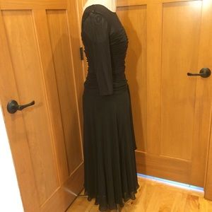Sangria fully lined black midi dress with a bateau neckline and V-back, mesh 3/4 - length sleeves, shirred bodice and full skirt with sheer asymmetrical sash. The tag says 16, but the fit is more like 12 or 14. New with tags.