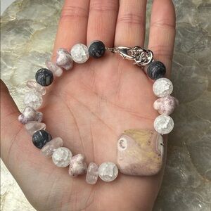 Six strands of pink, blue, green rice pearls with lobster clasp closure bracelet. Measures 7.5”-9” in long. Handmade in Maine with ❤️ one of a kind, no duplicates.