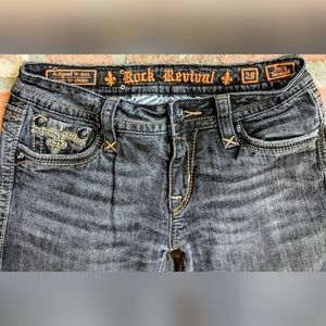 Rock Revival Faded Black Sora Straight Jeans in a size 29. Pre loved in perfect condition. 5 pocket, single button closure with Black RR buttons and adorned with Gold stitching and rhinestone accents. No rips, tares, strains or odors. They have been washed. Measurements- Waist laid flat-14.5, Inseam-32, Rise-8, Style#-RE8266T3, Color-Sora TO, 98% Cotton, 2% Elastane. Pair with heels or Chucks!