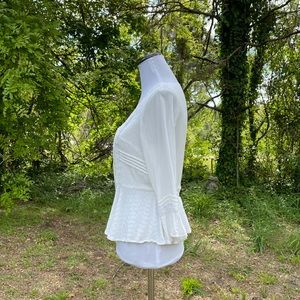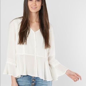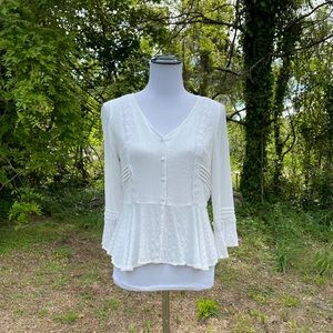 Miss Me Embroidered Chiffon Blouse. Pleated V-neck button down peplum blouse. Bell sleeves. Crochet applique and back tie details. Lined.