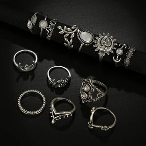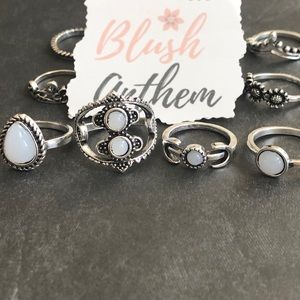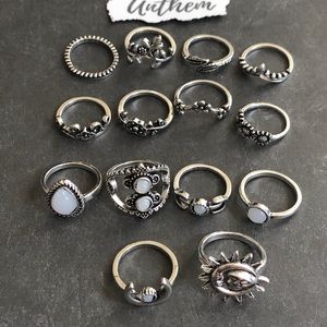 14 rings included. Zinc alloy antique silver tone faux white stone fashion jewelry. Size was not given by vendor.