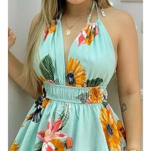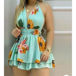 Sexy, summer, halter, neck tie, elastic waist, romper. Look is ruffle on top and shorts under.