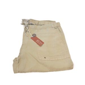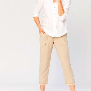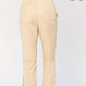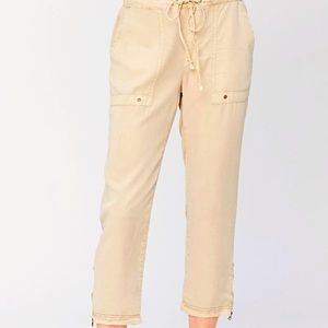 This ankle pant features super soft Tencel twill body, a drawstring waistband, front and back pockets with stitching and grommet details, zippers on side seams at hemline.